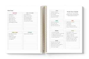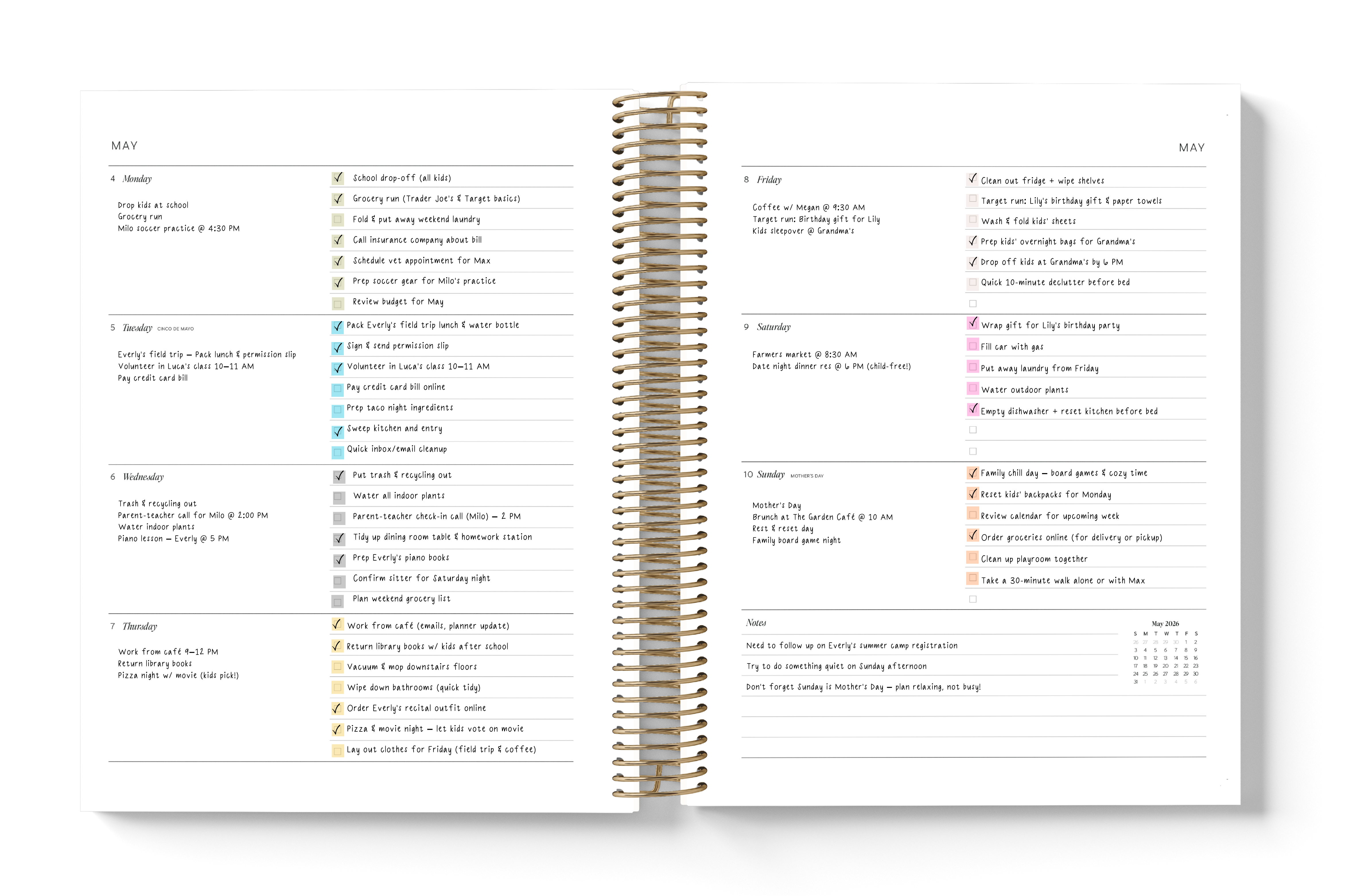 All the parenting tools and organization pages you love from the Mom Planner, but with a simpler weekly layout. No daily pages or time-blocking – just a clear view of your whole week in one place.
