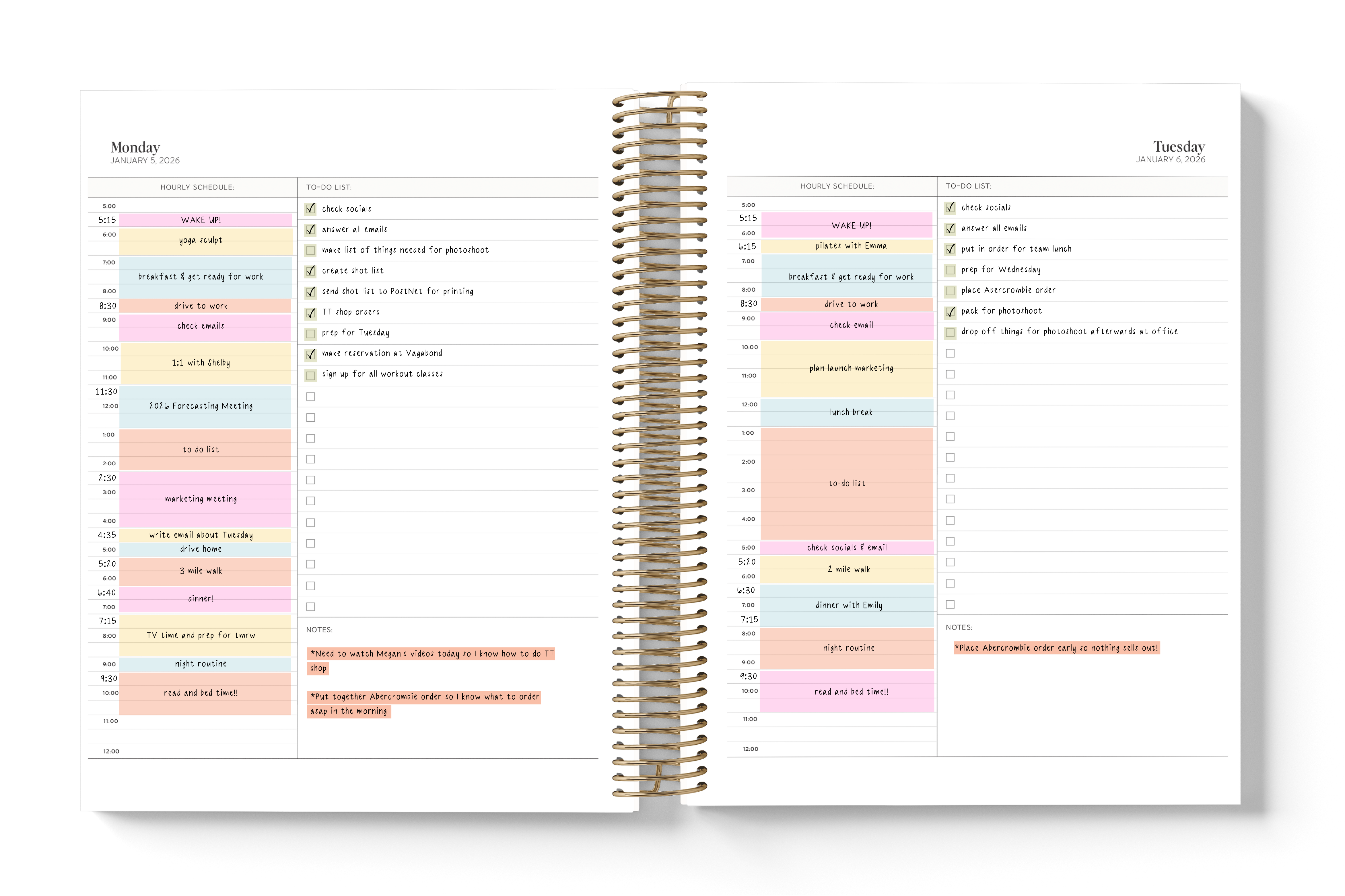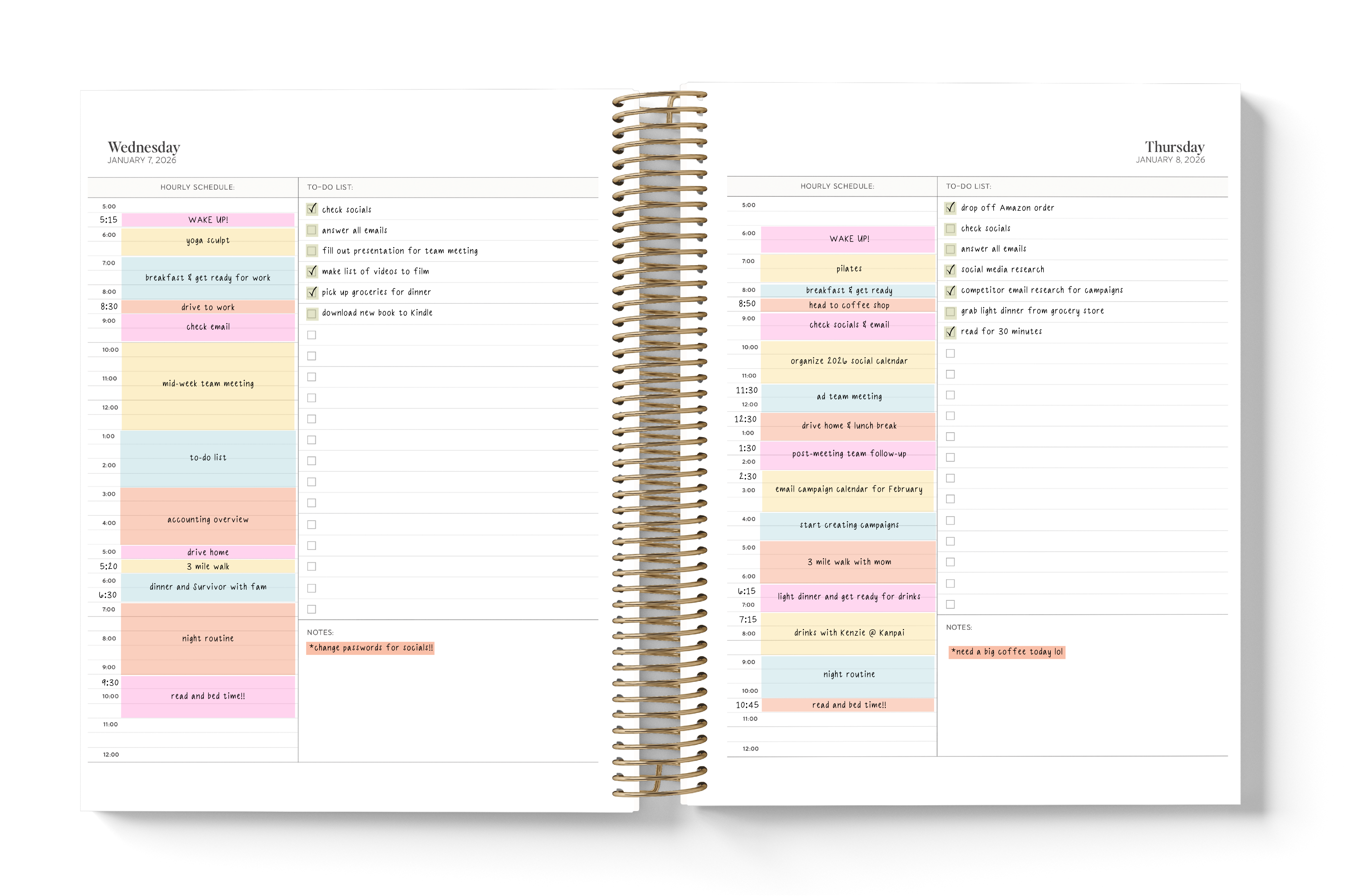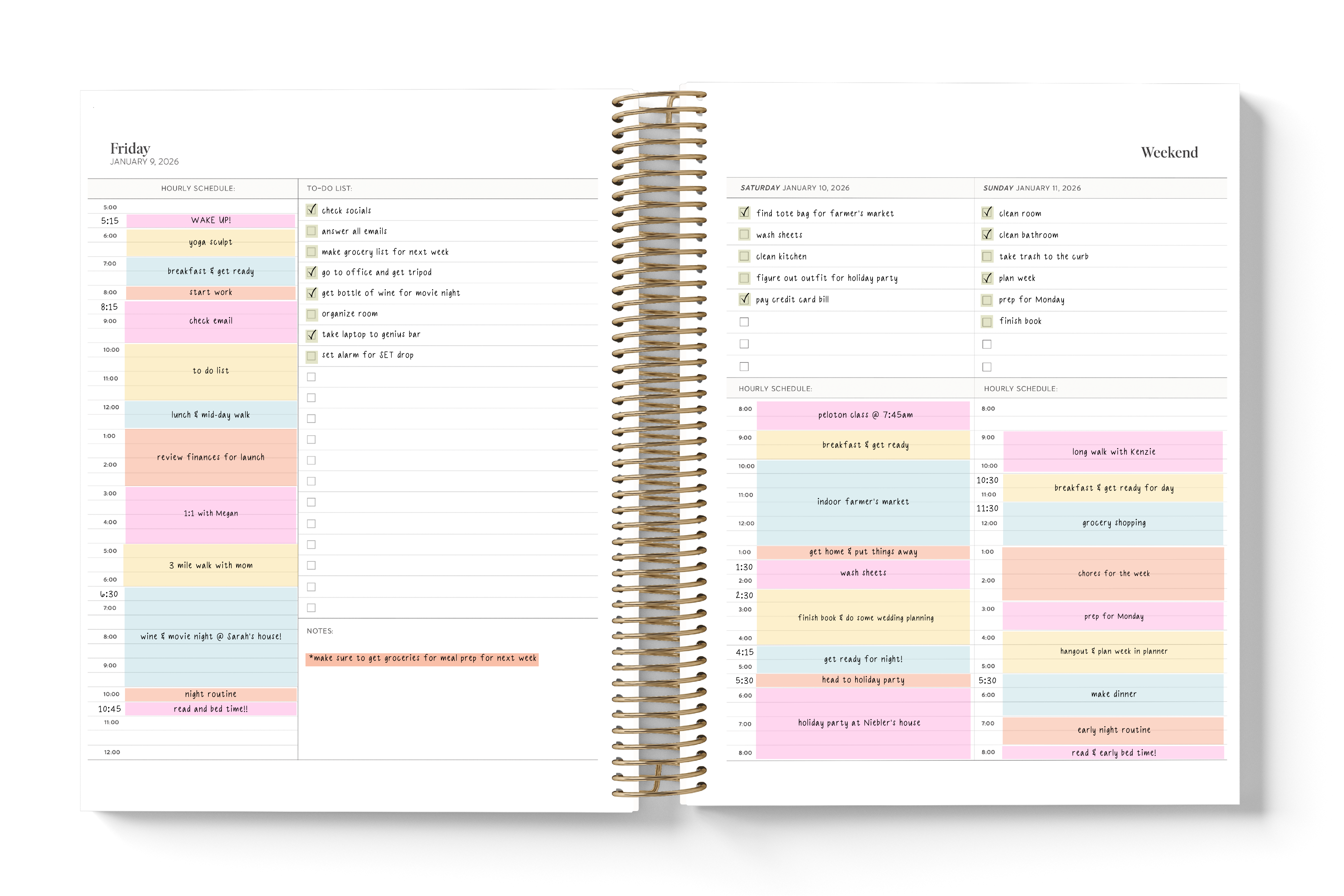 Ideal for those who prefer detailed, day-to-day planning (even on weekends!). It offers ample space for daily time-blocking, task lists, and notes, making it perfect for anyone with a busy schedule who needs to manage their time meticulously.​