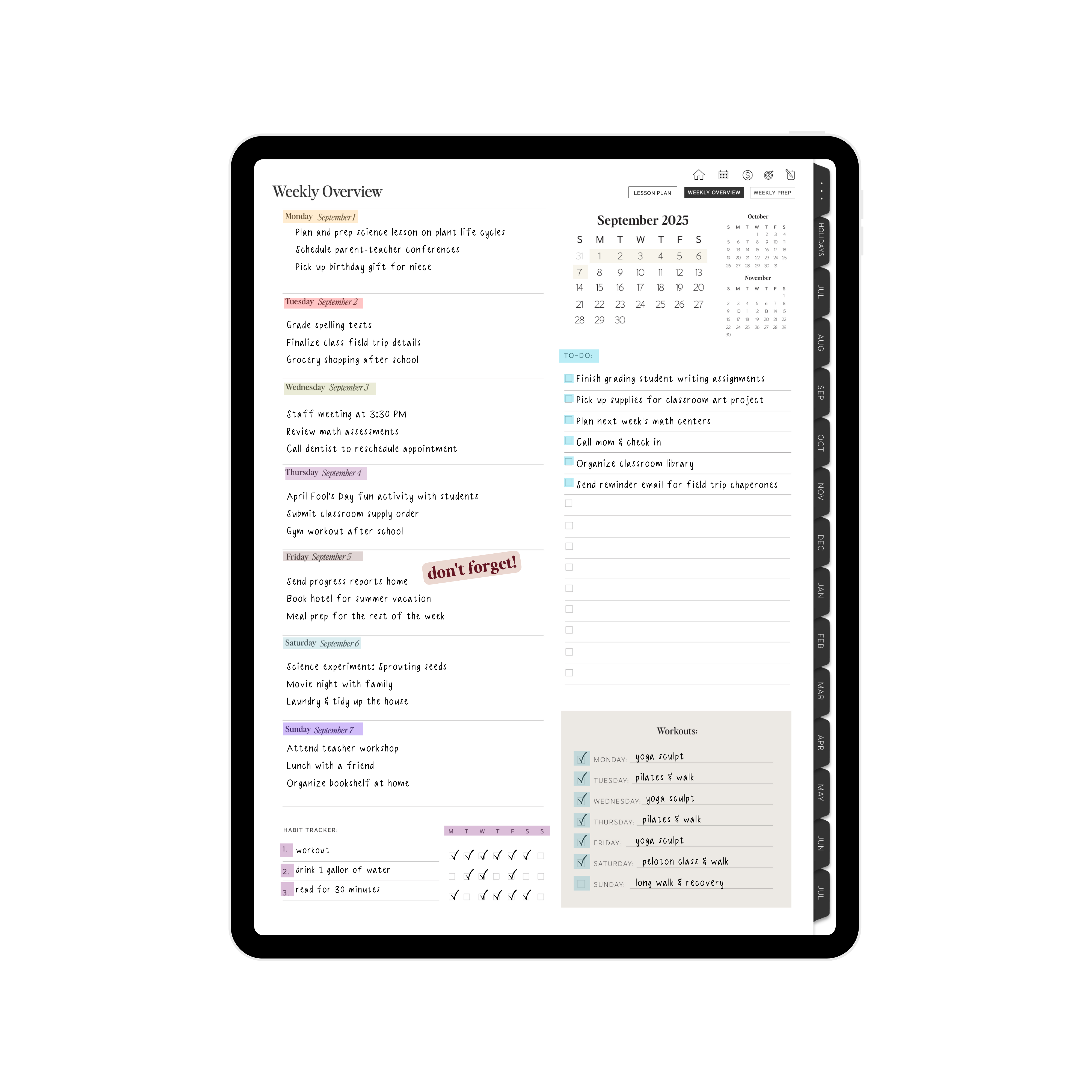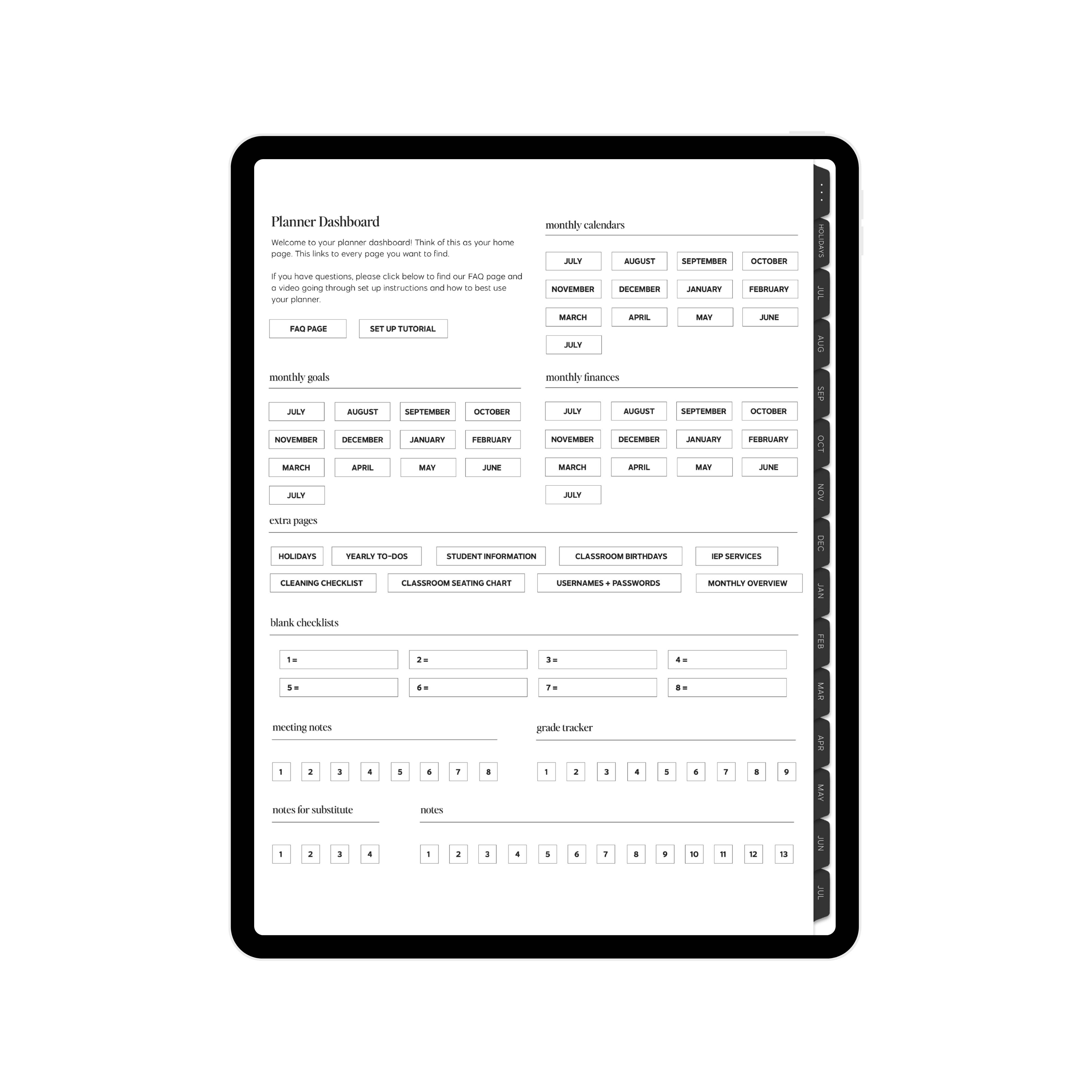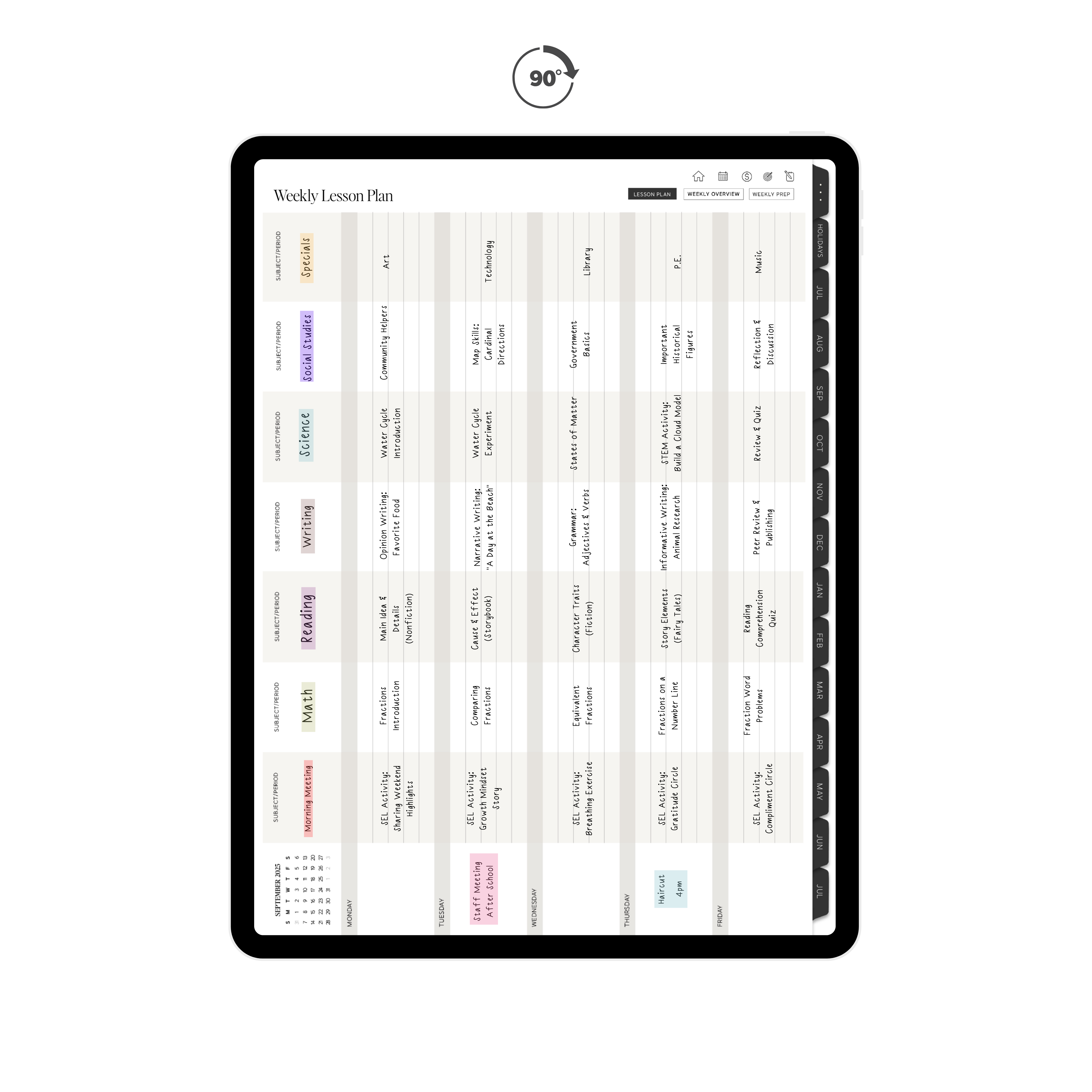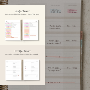 All the teacher-focused pages you need, but featuring a weekly layout rather than individual daily pages. No time-blocking, just a simple weekly view for planning lessons and classroom activities and managing tasks at a glance.