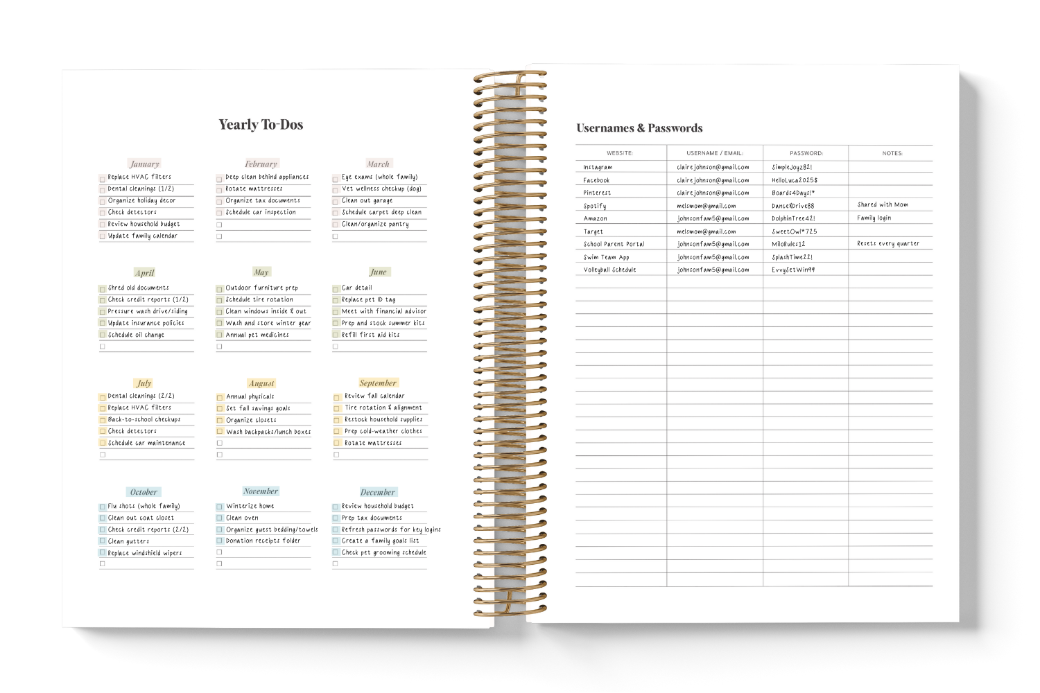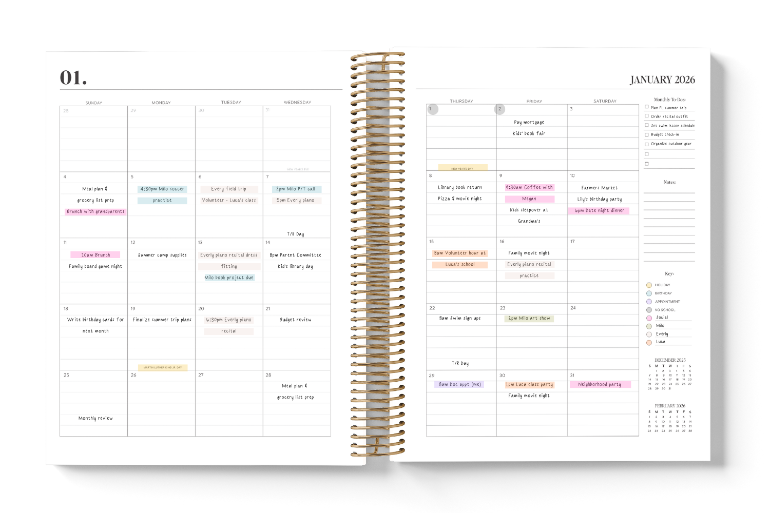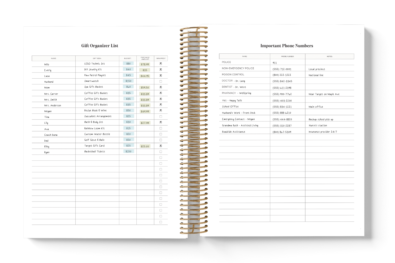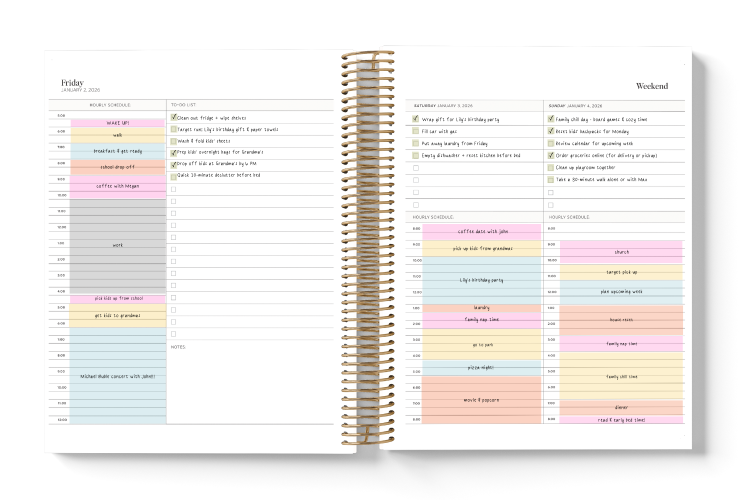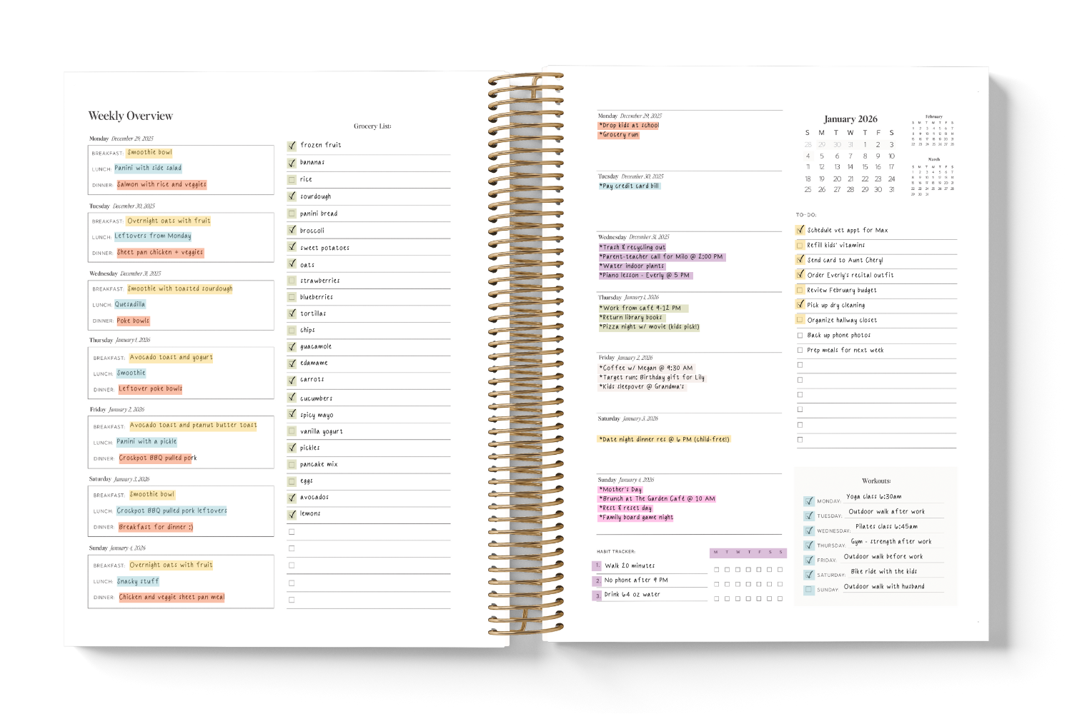 All the parenting tools and organization pages you love from the Mom Planner, but with a simpler weekly layout. No daily pages or time-blocking – just a clear view of your whole week in one place.
