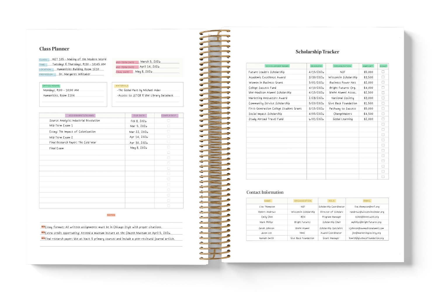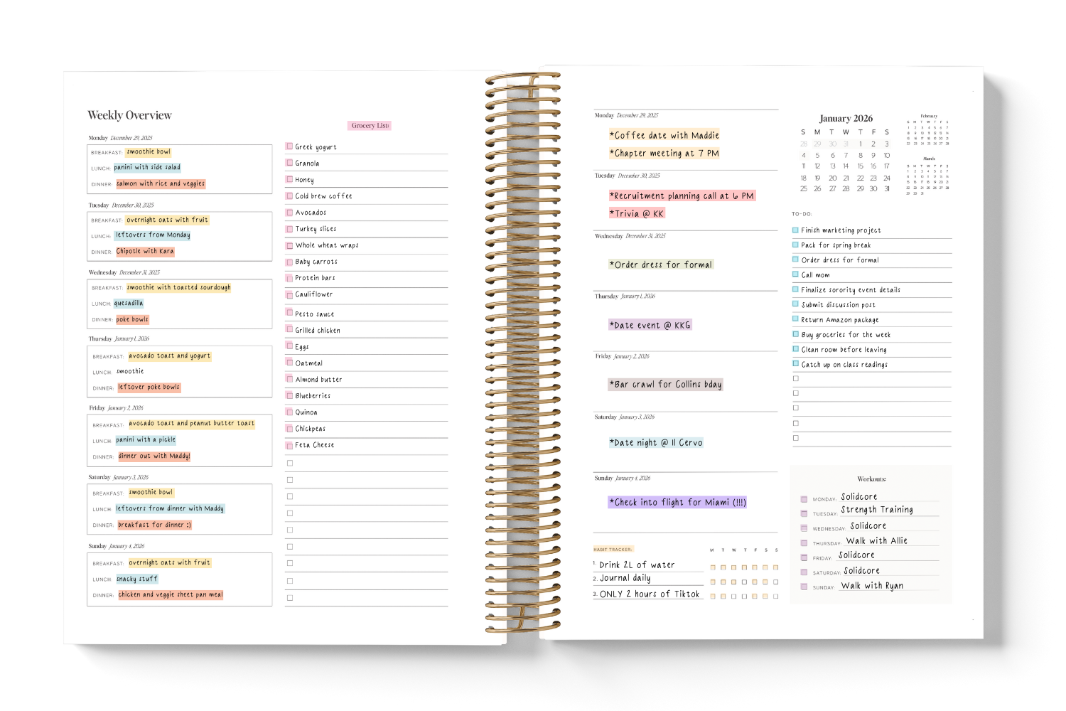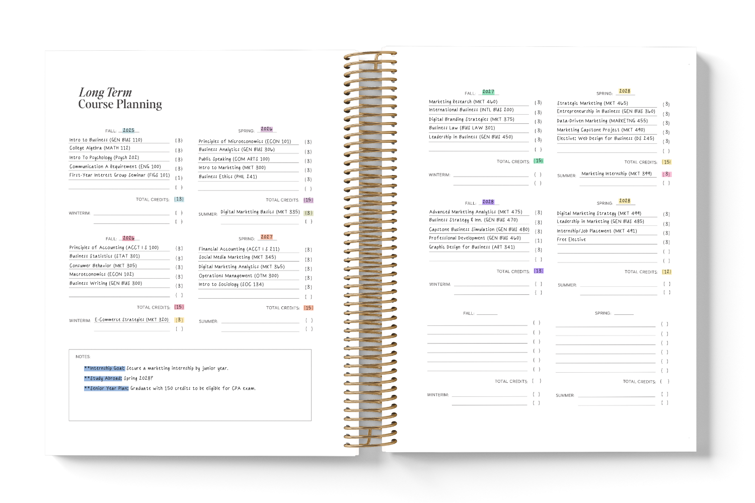 Designed for students, the College Planner includes academic layouts like semester schedules and long-term course planning, with individual daily time-blocking pages to help balance school and life down to the last detail.
