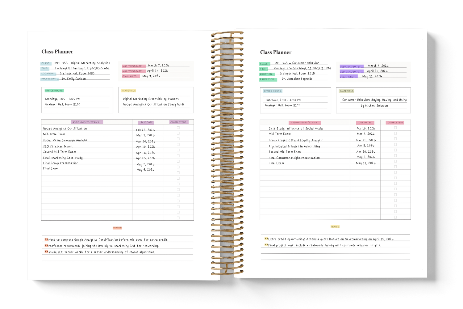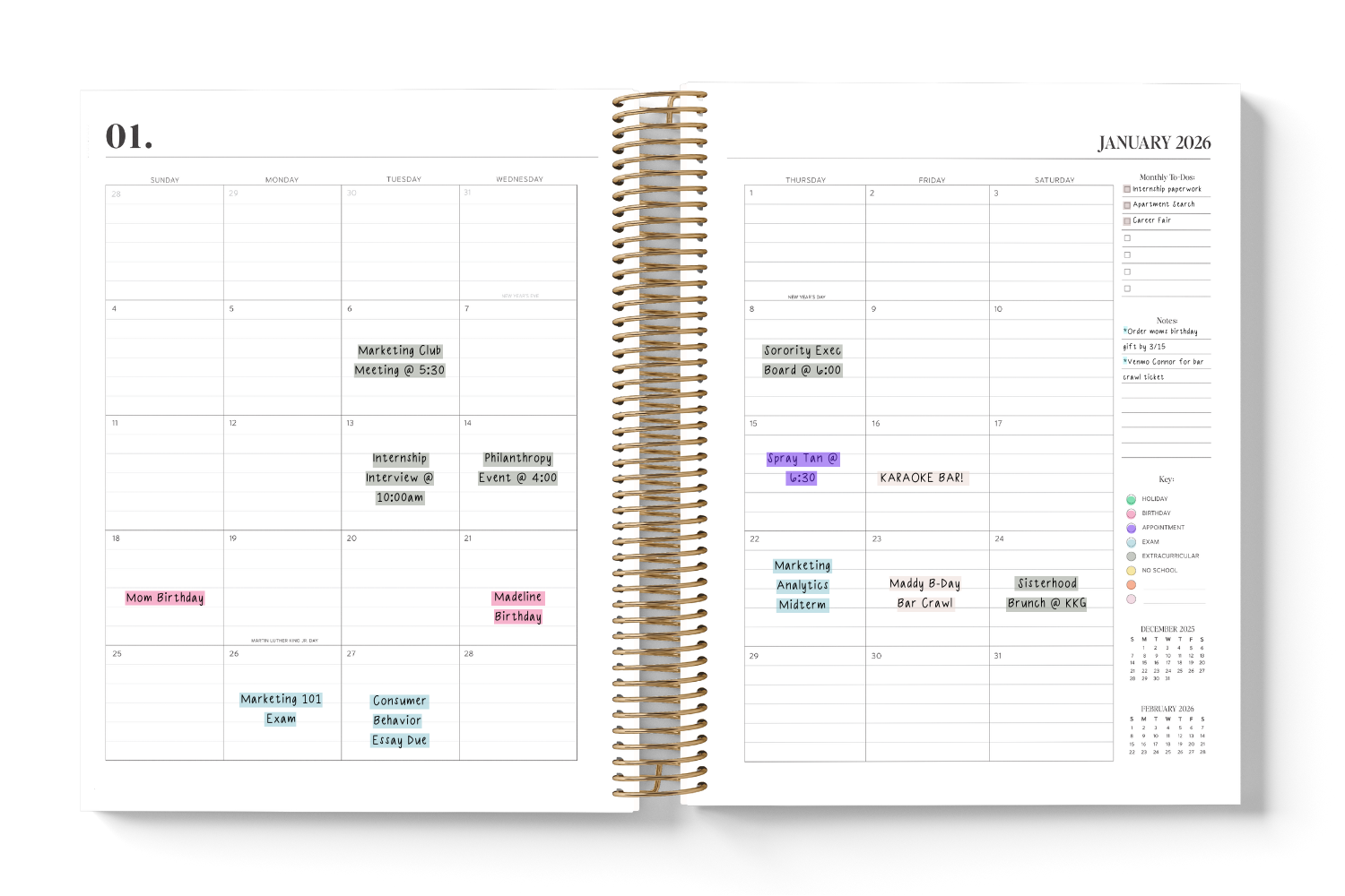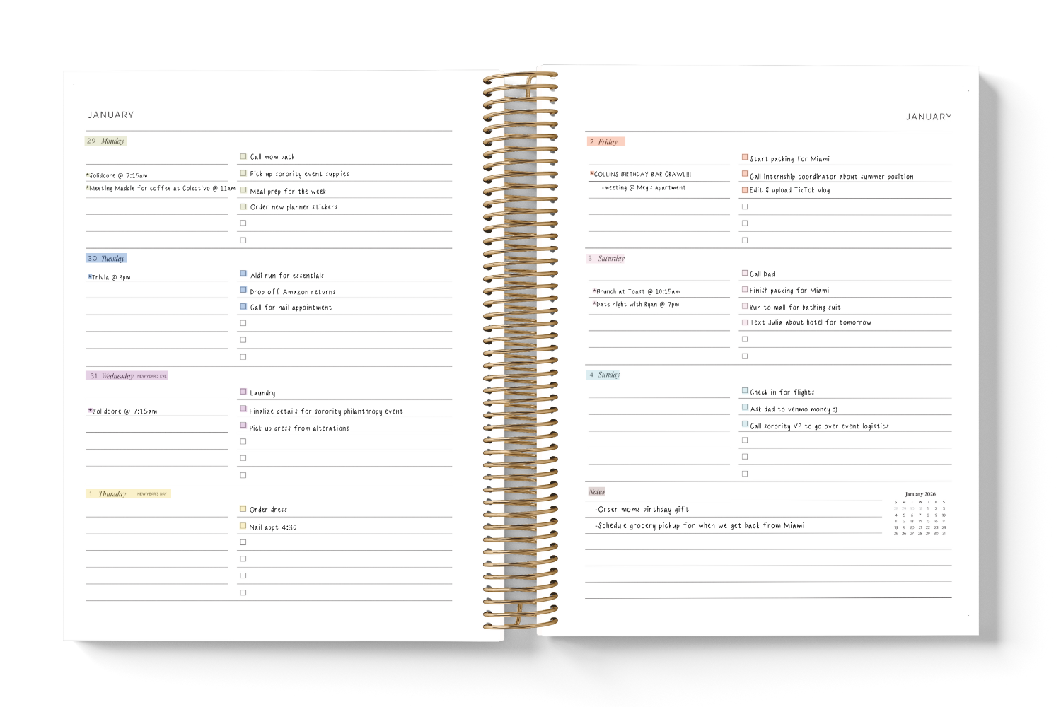 Designed for students, the College Planner includes academic layouts like semester schedules and long-term course planning, with individual daily time-blocking pages to help balance school and life down to the last detail.