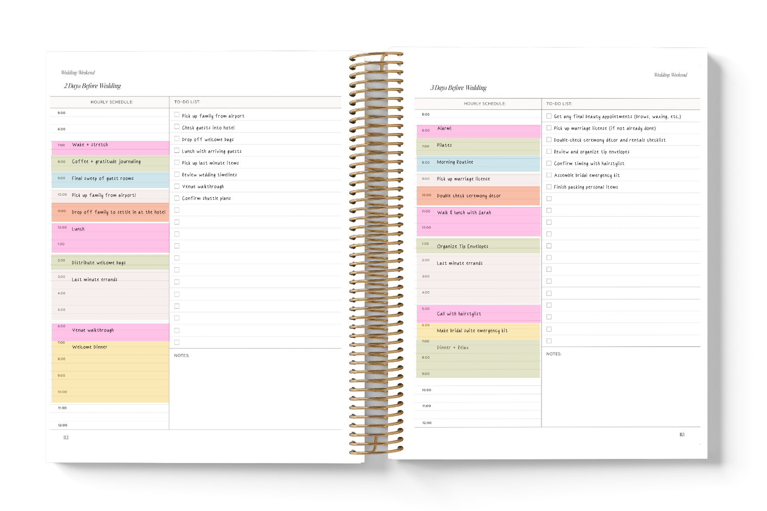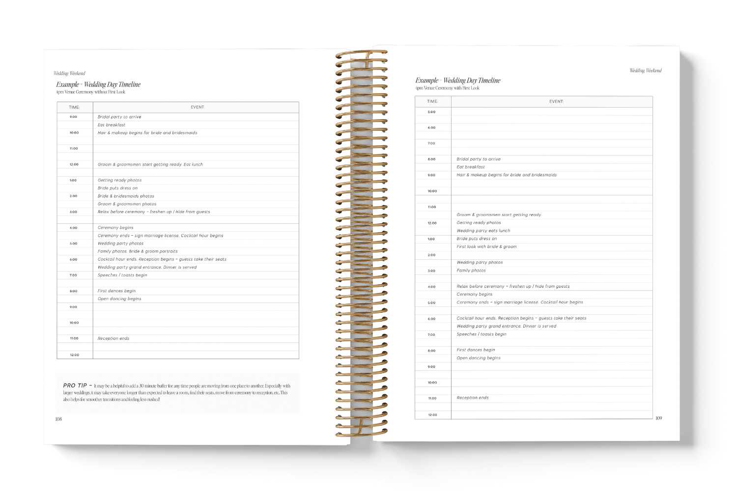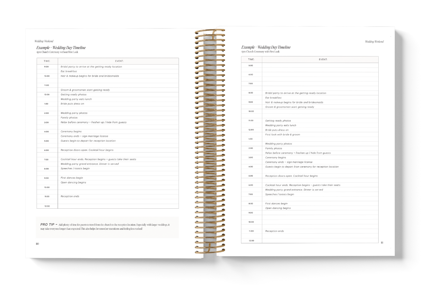 If you’re looking for a printable wedding day planner, we recommend also adding our Wedding Binder Template to your arsenal to help keep your wedding party and vendors organized all wedding weekend long.